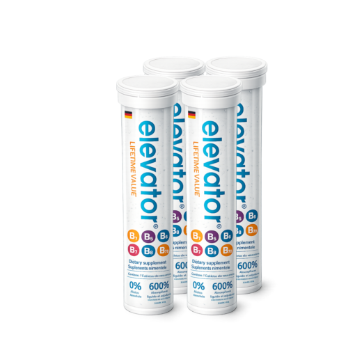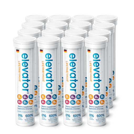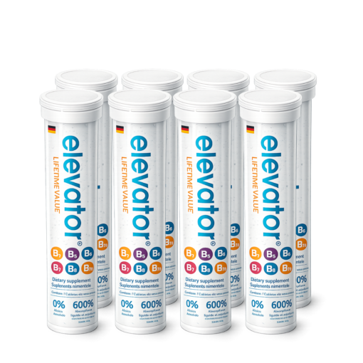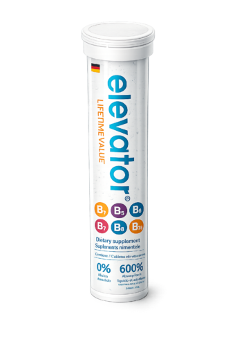 Elevator, vitamina B es una pastilla efervescente, está elaborado en Alemania; además, está registrado ante la Cofepris